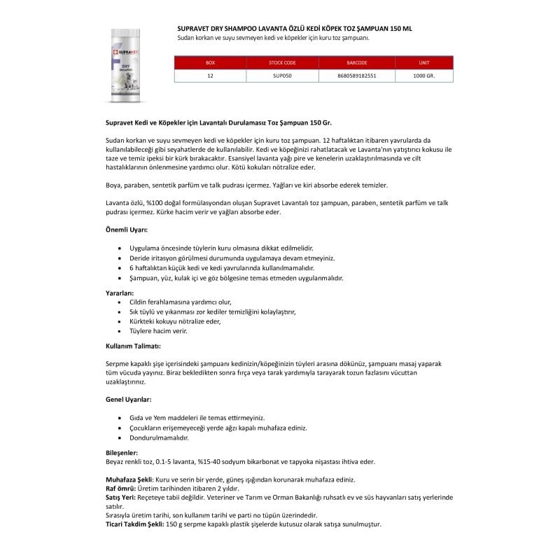 Supravet Dry Shampoo Lavanta Özlü Kedi ve Köpek Toz Şampuan, evcil hayvanlarınızın temizliği ve bakımı konusunda pratik bir çözüm sunar.